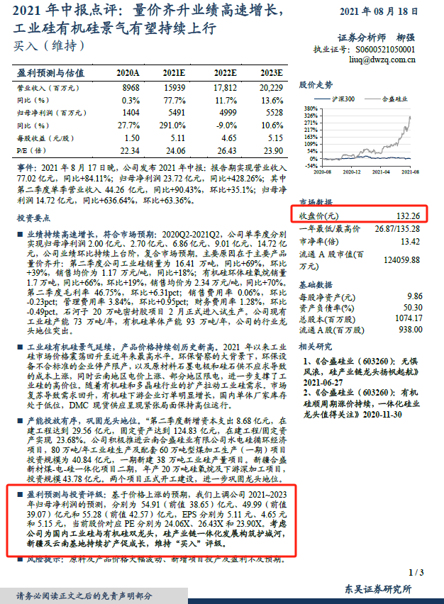 2021年8月18日,东吴证券发布研报称:“基于价格上涨的预期,我们上调公司2021~2023年归母净利润的预测,分别为54.91(前值38.65)亿元、49.99(前值39.07)亿元和55.28(前值42.57)亿元,EPS分别为5.11元、4.65元和5.15元,当前股价对应PE分别为24.06X、26.43X和23.90X。考虑公司为国内工业硅与有机硅双龙头,硅产业链一体化发展构筑护城河,新疆及云南基地持续扩产促成长,维持“买入”评级。”