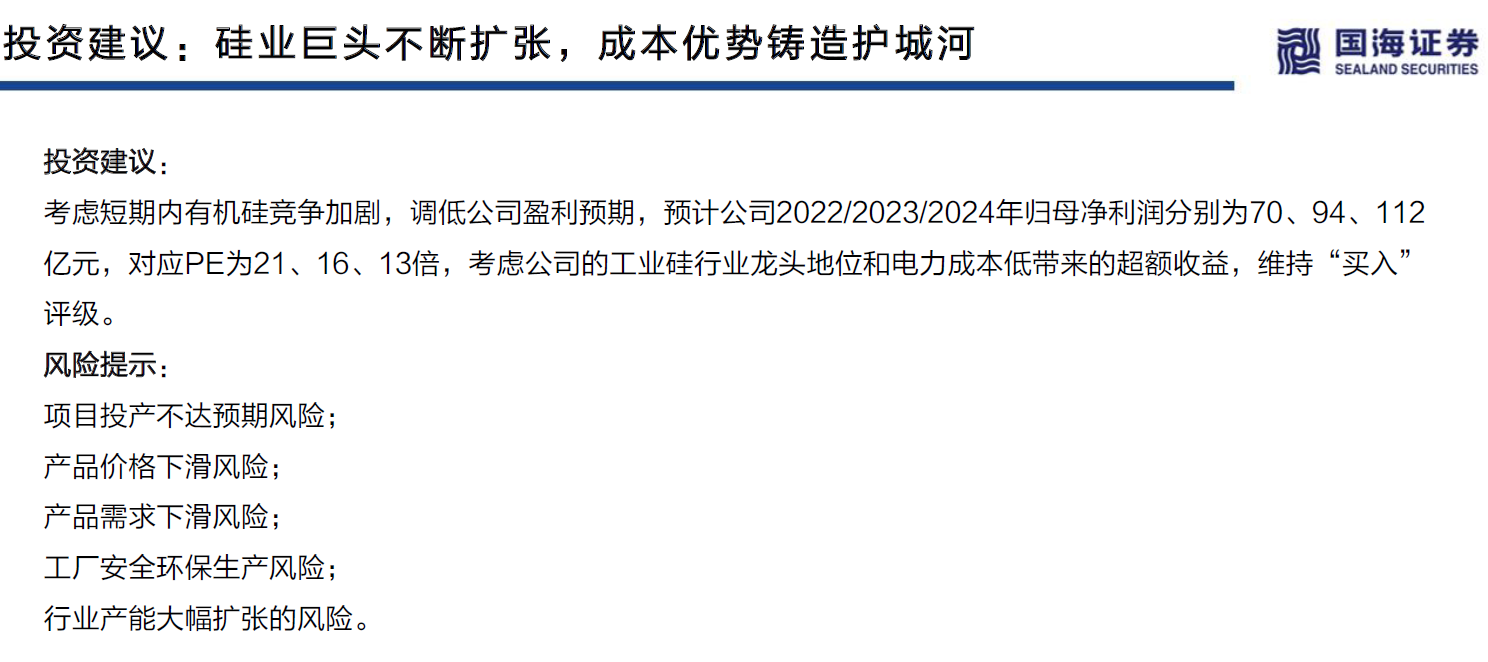 就在2022年8月的股价相对高点,国海证券发布长篇研报称:“考虑短期内有机硅竞争加剧,调低公司盈利预期,预计公司2022/2023/2024年归母净利润分别为70、94、112亿元,对应PE为21、16、13倍,考虑公司的工业硅行业龙头地位和电力成本低带来的超额收益,维持“买入”评级。”