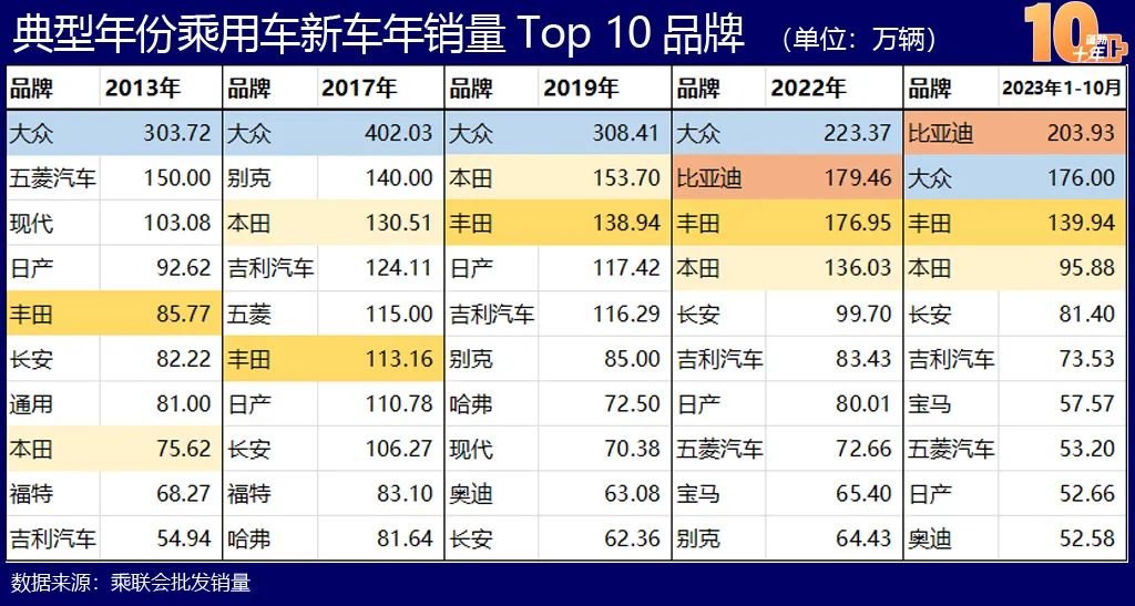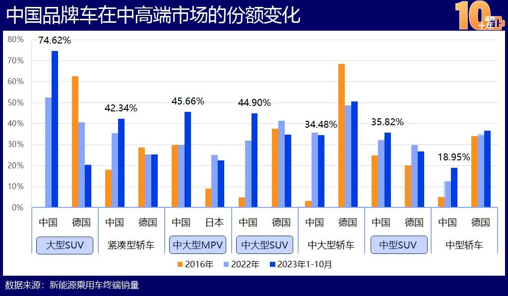 大型SUV市场,在2020年之前中国品牌占有率不到1%,2023年前10个月,一举飙升到75%;中大型SUV市场,2016年之前不足5%,今年前10个月增长到45%;中大型轿车,2020年之前徘徊在2-3%,今年前十个月中国品牌的市占率达到34.5%。消费基数最大的紧凑型轿车,中国品牌的份额终于在2022年突破了30%的“不破天花板”,耗时20余年,今年前十个月已经达到了42%。