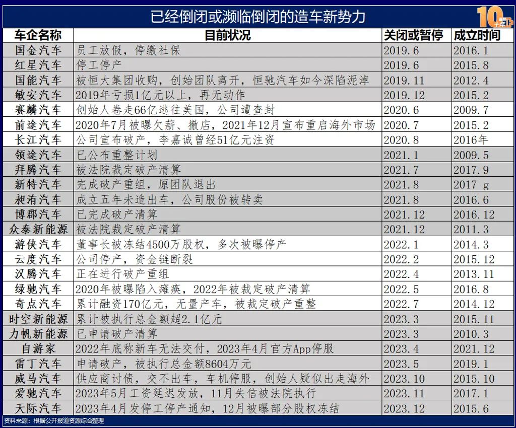 粗略估算,从2013年开始,宣称进场造车的新势力不下40家。故事的开头都是意气风发,创始人有背景、技术够先进、产品有前途、融资上市有能力……不过有些故事讲着讲着就讲不下去了,从2019年补贴剧烈退坡开始,已经有20多家走向了终局,基本上以每年5家以上的速度在倒闭,即便是在2023年,不断有人离场的故事依然在继续。