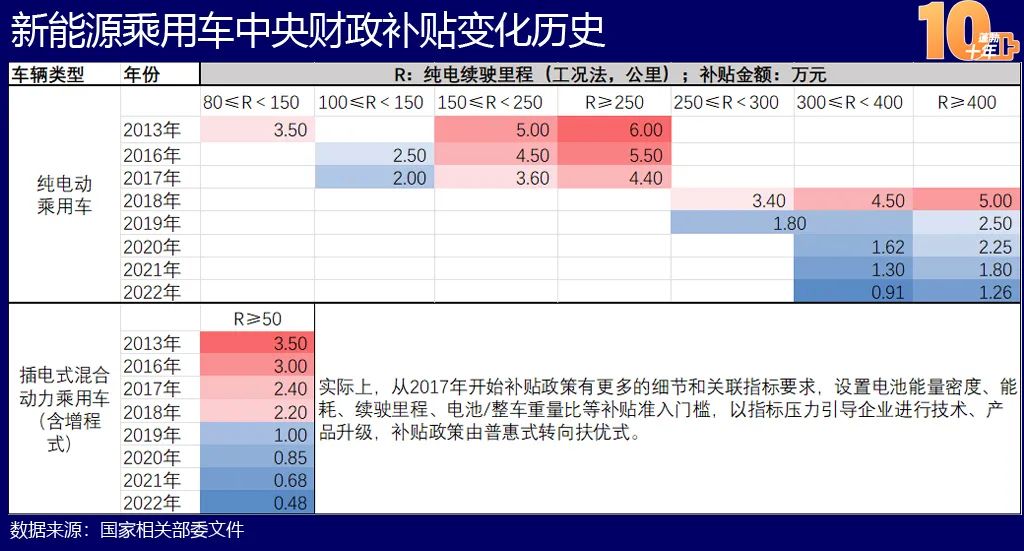 对行业影响最大的补贴政策本身,在13年中经历了多次调整,深刻影响了新能源汽车产业的走向。