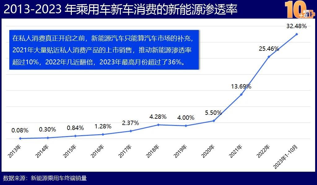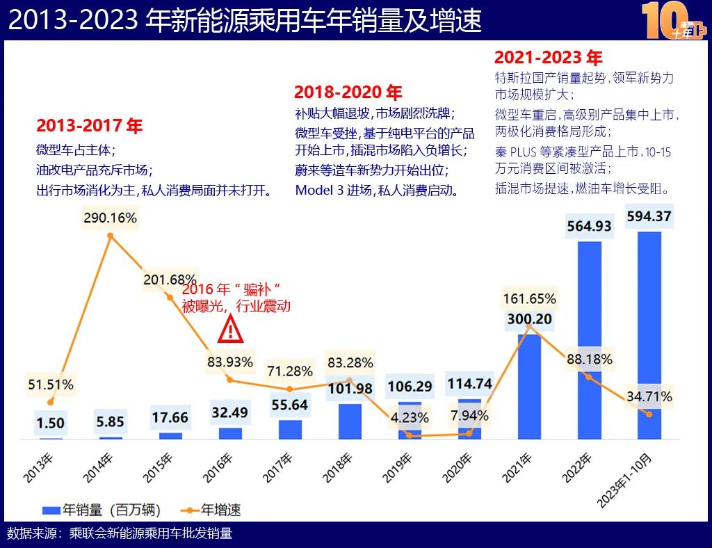 从2013年的1.5万辆,到2023年的600多万辆,规模上是天翻地覆的飞跃,内里更是一部政策与市场、车企与消费者的角力交锋史,以及产品和竞争的迭代史。