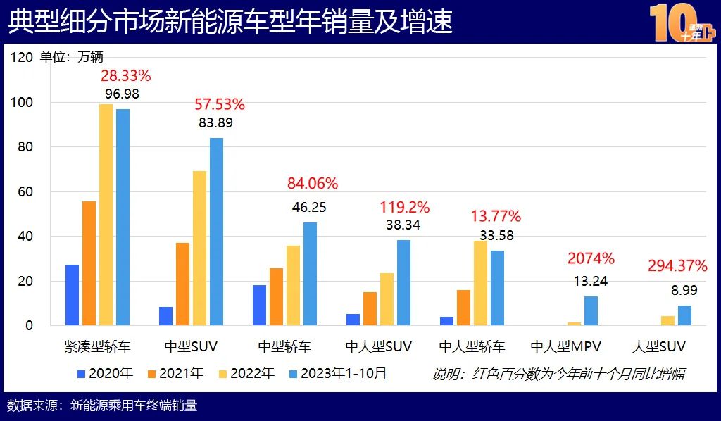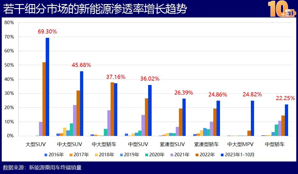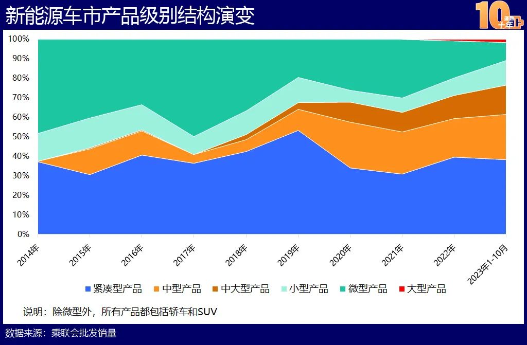 在2017年以前,微型车和小型车(含SUV)占到新能源市场70%左右,为数不多的中型产品是初代唐新能源、腾势、荣威e950等。2017年,微型车更是占到市场的一半,中型产品占比被压缩。2020年开始,中型、中大型车消费份额大幅增长,二者合计从不足10%增长到34%,到2023年前10个月已经接近40%,微型车和小型车的消费空间被急剧压缩。