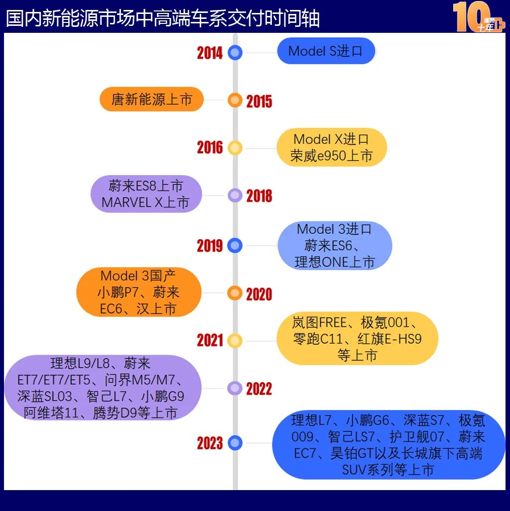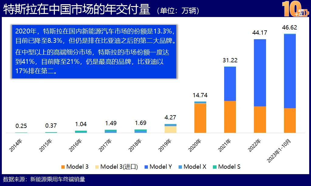 特斯拉进入中国市场也恰好是10年,2023年全年销量超50万辆没有悬念,是仅次于比亚迪的新能源品牌,在高端细分市场则稳坐头把交椅。不过随着越来越多的中国品牌高端车上市,被围攻的特斯拉的市场份额已经受到挤压:Model 3在中型新能源轿车市场的份额从2020年的76%下降到了目前的30%,Model Y在中型SUV市场的份额还是有41%之多,不过比起2022年也已下降了4个百分点。