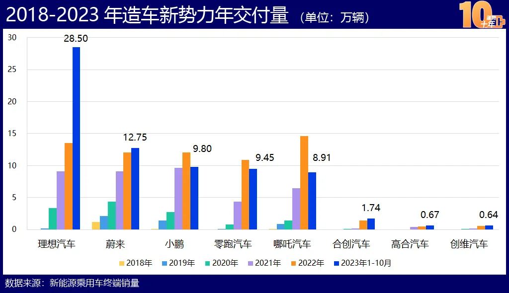 时间走到2023年,还活着、且有产品在售的造车新势力仅有8家,从四五十家到8家,淘汰率高达80%。2023年前10个月,这8家新势力的合计销量为72.5万,占同期新能源车总销量的13%。