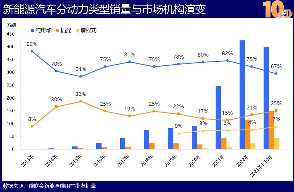 市场的反应更是清晰,2022年、2023年,插混和增程式车型的增速大大超过纯电车型:2022年纯电动车销量同比增长73.1%,插混和增程式分别增长了165%和122%,2023年前10个月纯电动车销量仅增长了19.1%,而插混和增程式分别增长了71%和155%。