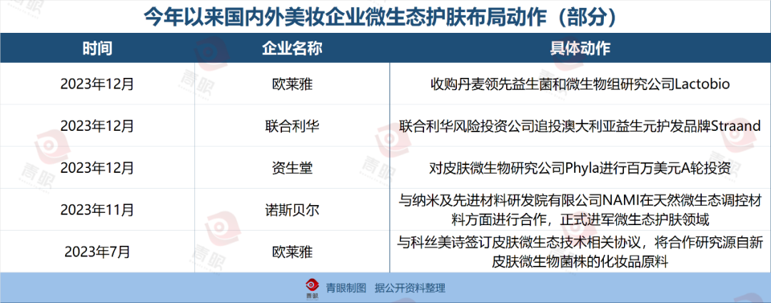 青眼梳理发现,开年以来,欧莱雅、资生堂、联合利华等国际美妆巨头纷纷通过收购、投资新品牌等方式,加码微生态护肤赛道。与此同时,国内微生态护肤市场也愈发热闹,诺斯贝尔、福瑞达、上美股份等都在微生态护肤领域有所动作或建树。