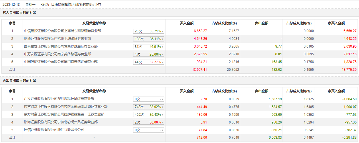 捷荣技术12月18日涨停,全天换手率达11.41%,振幅达11.46%。龙虎榜数据显示,营业部席位合计净买入1.35亿元。其中,中信建投证券上海浦东南路证券营业部、财通证券杭州上塘路证券营业部分别买入6658.27万元、4648.26万元;广发证券深圳深科技城证券营业部、东方财富证券拉萨金融城南环路证券营业部分别卖出1687.19万元、1534.57万元。