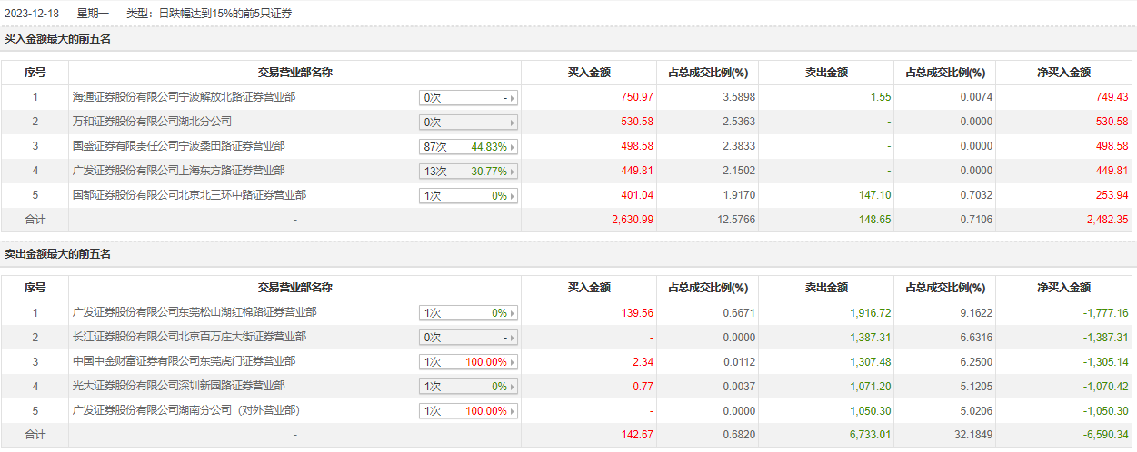 *ST左江12月18日跌停,龙虎榜数据显示,上榜营业部席位全天成交9655.32万元,占当日总成交金额比例为46.15%。其中,买入金额为2773.66万元,卖出金额为6881.66万元,合计净卖出4107.99万元。