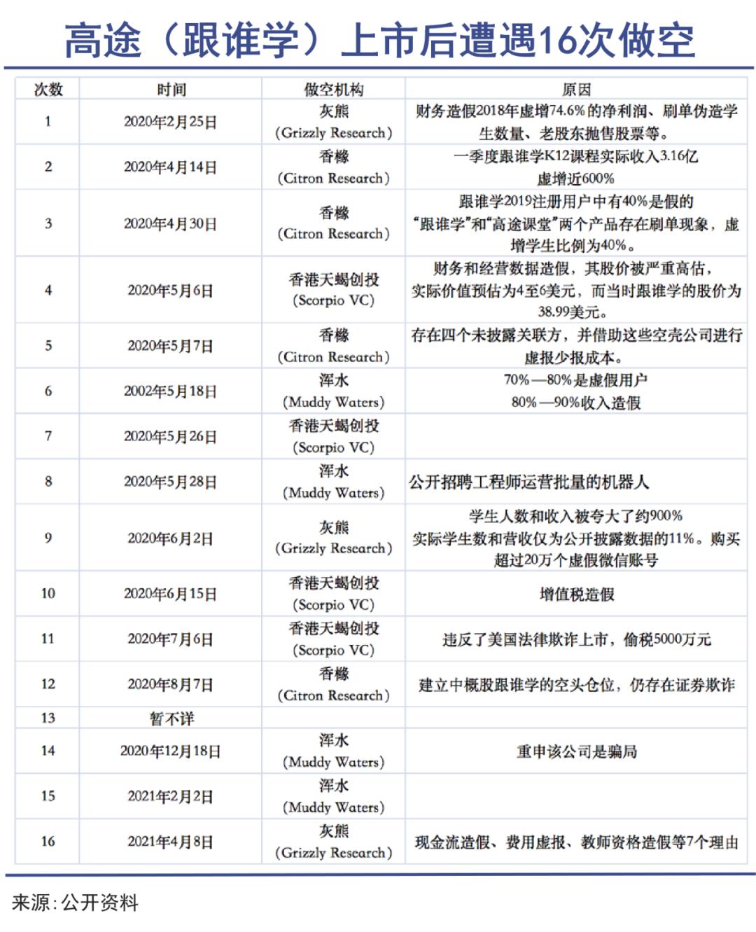 上市后,跟谁学连续几个季度都呈现300%多的增长,并且还是盈利性增长。这实在让海外机构看不太懂。上市后,跟谁学遭遇了罕见的16次做空,但每一次做空后,其股价反而继续上拉,外界也因此称陈向东为“拉总”。