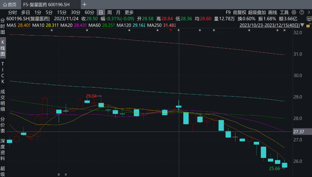 事实上,自上海证券交易所与中证指数有限公司发布调整公告,复星医药的股价就开始一路下行。从11月24日收盘28.5元/股,下跌到12月18日收盘25.09元/股,跌幅12%。
