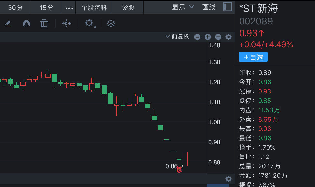 *ST新海(002089.SZ)跌成“仙股”,有资金慌了。