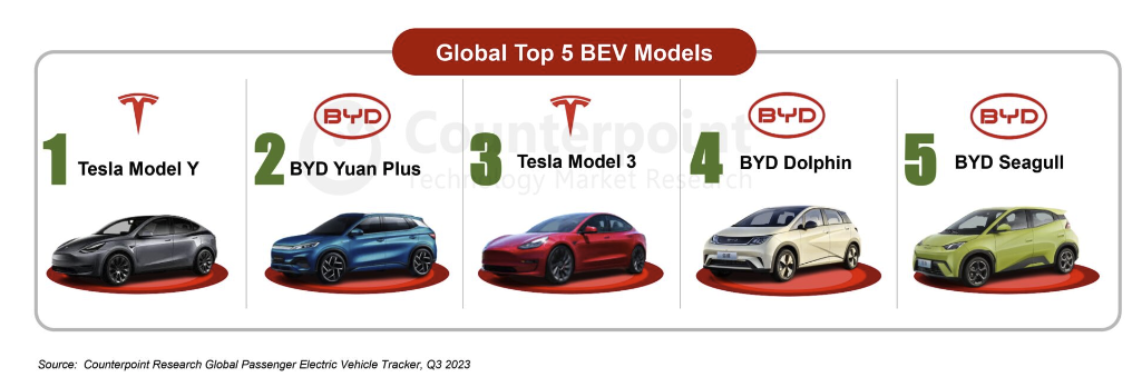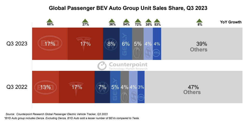 当地时间12月18日,市场调查机构Counterpoint Research发布最新报告指出,2023年第三季度全球乘用车纯电车型(BEV)销量同比增长29%。特斯拉、比亚迪汽车和大众汽车是最畅销的纯电动汽车集团。第三季度,比亚迪汽车(不包括腾势)已经赶上特斯拉,目前两者的市占率均为17%。该机构预计比亚迪汽车(不包括腾势)销量将在第四季度超过特斯拉,成为全球第一。
