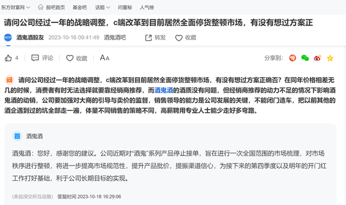 此消息一出,便引来市场广泛反响。在深交所互动易平台上,有投资者提出:请问公司经过一年的战略调整,C端改革到目前居然全面停货整顿市场,有没有想过方案正确否?