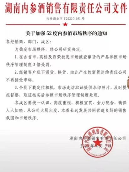 今年4月19日,酒鬼酒下属湖南内参酒销售有限责任公司发布《关于加强52度内参酒市场秩序的通知》,对窜货、低价销售行为,一旦查实将按合同签约量的5%扣减计划内的配额额度。