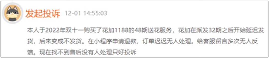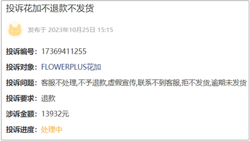 在黑猫投诉平台搜索“花加”,会出现超过13000条投诉,绝大部分反馈都是“不发货”“客服不回复”“无法退款”,诉求则以“退款”为主。