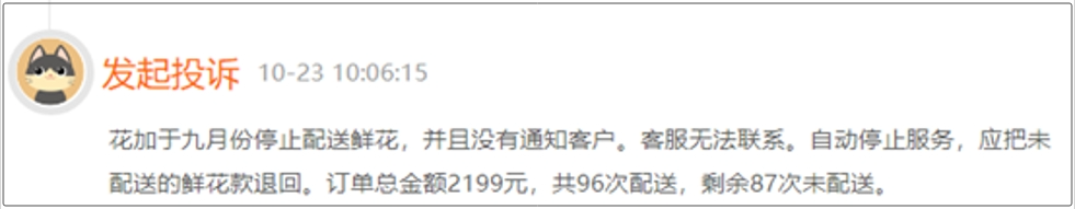 小谷是电商最爱的那类用户,她有很强的路径依赖性。结果,这种忠诚度如今换来的只有失望。她最近一笔“包年送半年”订单本该配送72次,结果只收到了16束花就再无下文,剩余未配送的56束花折合损失有2000多元。询问客服时,起初还能收到只言片语,后期则干脆无人应答。