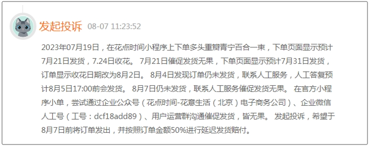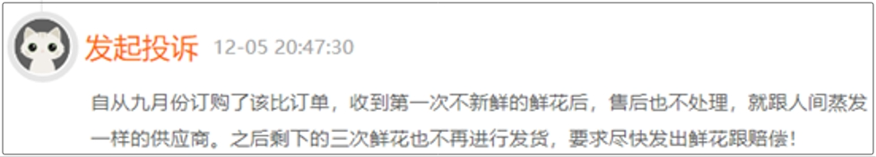 此外,还有不少网友投诉花点时间延迟发货、花束质量差等问题。
