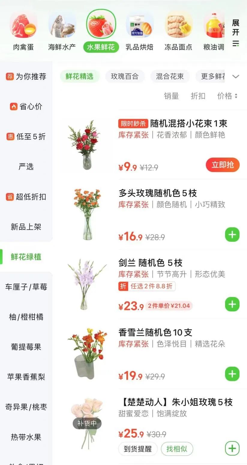 随着淘宝、拼多多、抖音、快手等互联网巨头杀入鲜花赛道,再加上美团买菜、盒马鲜生、叮咚买菜等生鲜电商入局,本就小众的市场变得更加血腥。