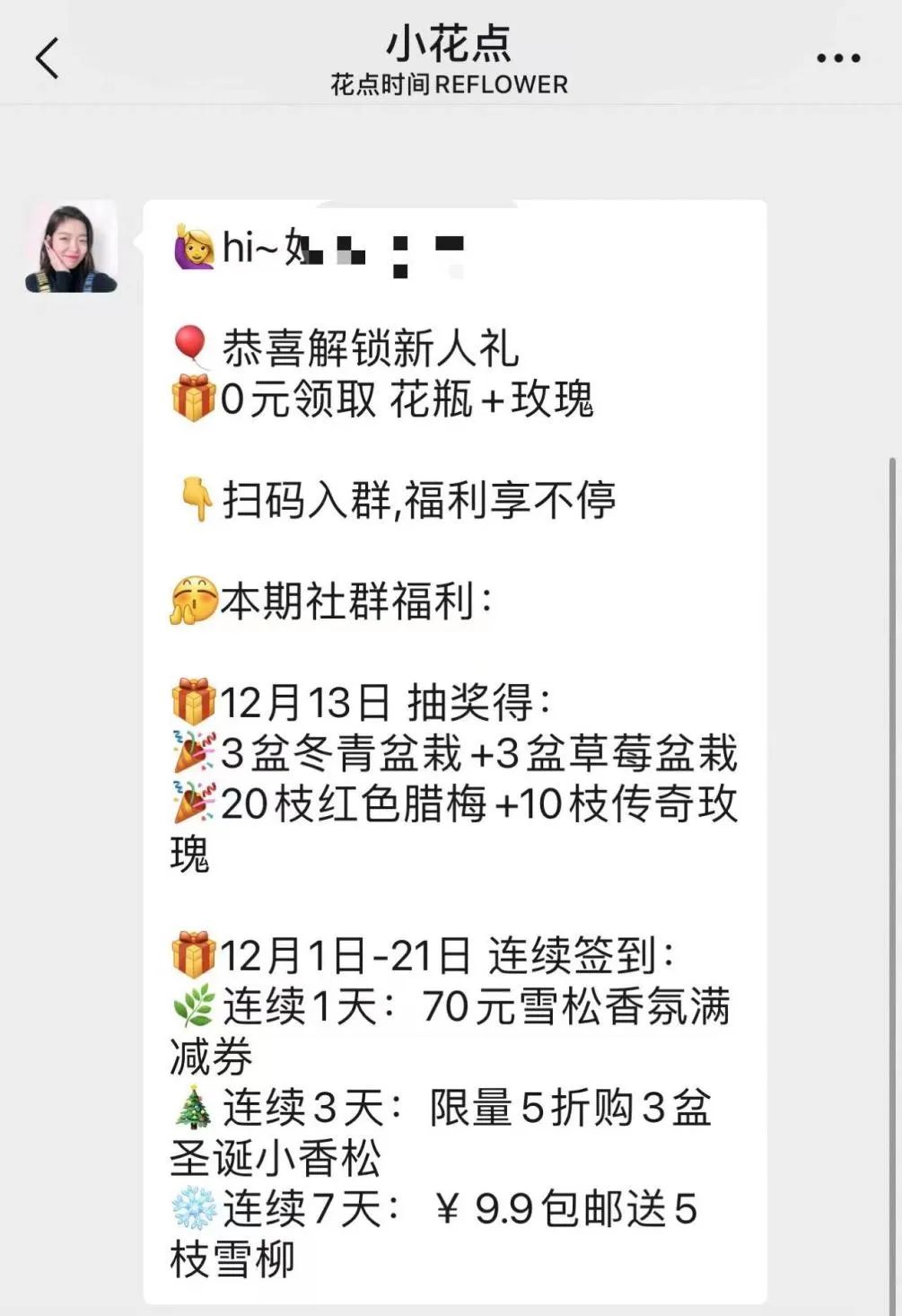 花点时间也在竭尽全力地挤入这场价格战。比如他们公众号最新推送的头条是“9.9元=3盆雪顶草莓+3盆冬青”。但当你被这个标题吸引进去之后,会发现这个价格需要进群抽奖,名额有限。其他优惠也绝非唾手可得,比如9.9元的5枝雪柳,需要连续签到7天。