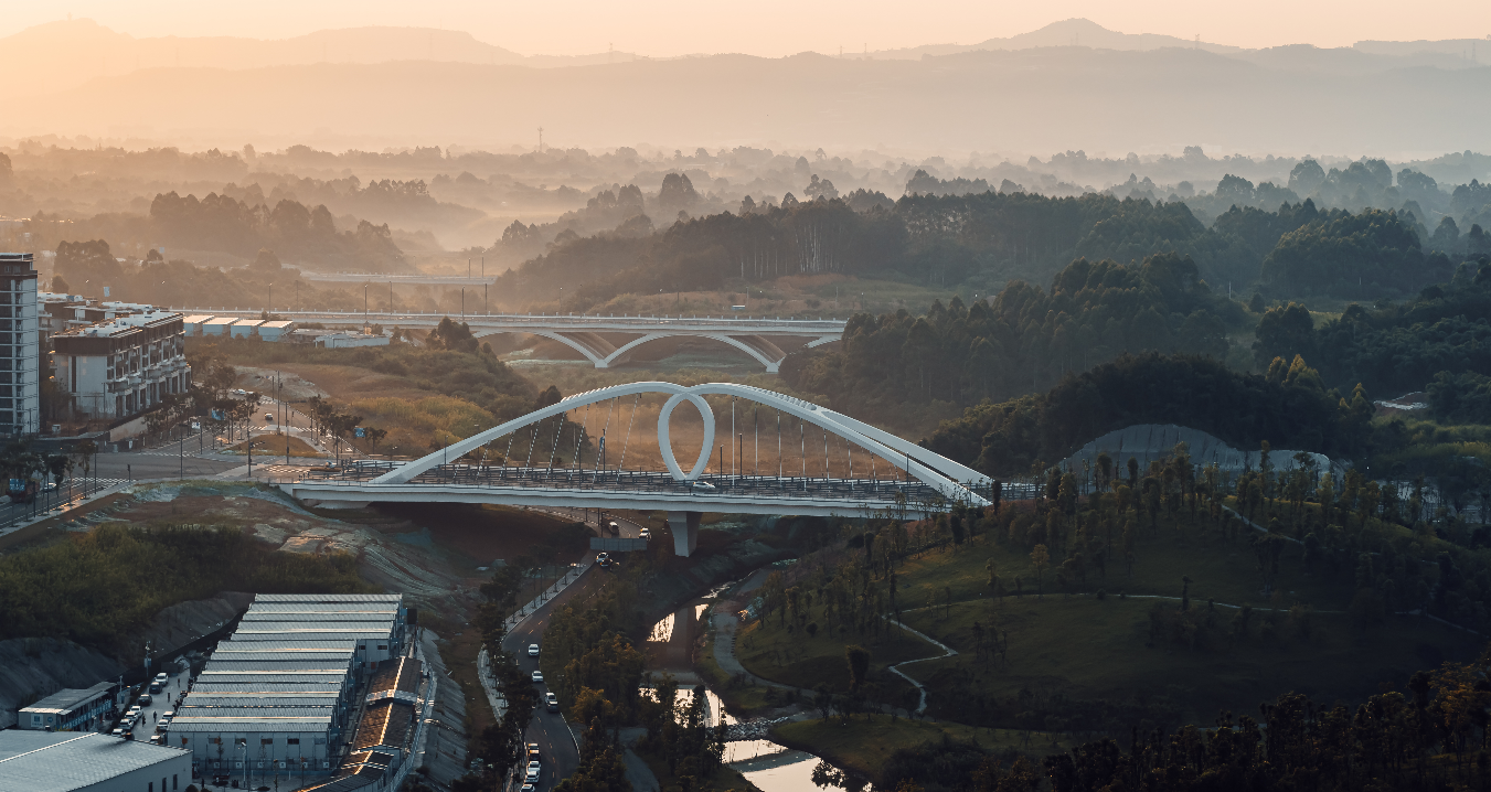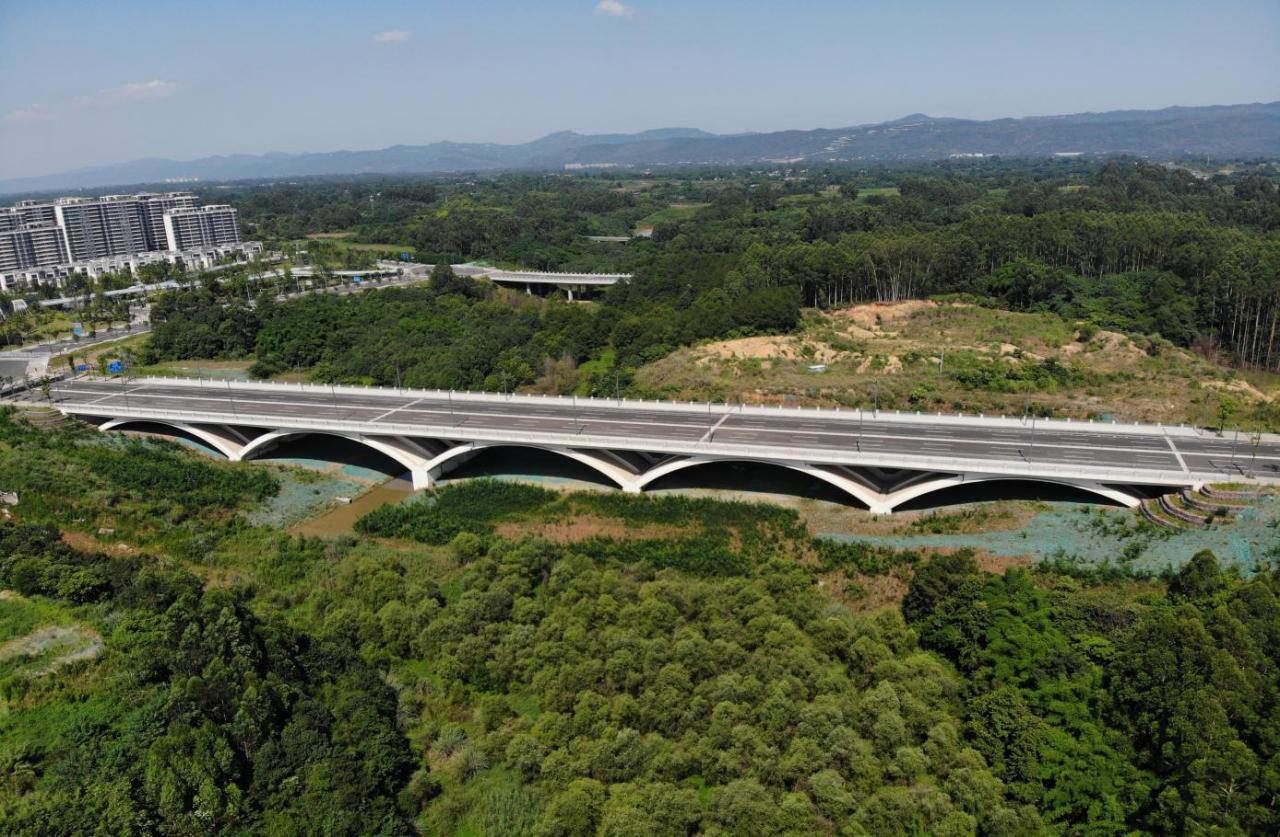 桥梁以传统中式现代连续拱桥结构为设计主调,外观是典雅的现代风格,展现了天府新区传承中国桥梁建筑国风,与公园城市、人文情怀和融统一盛景。