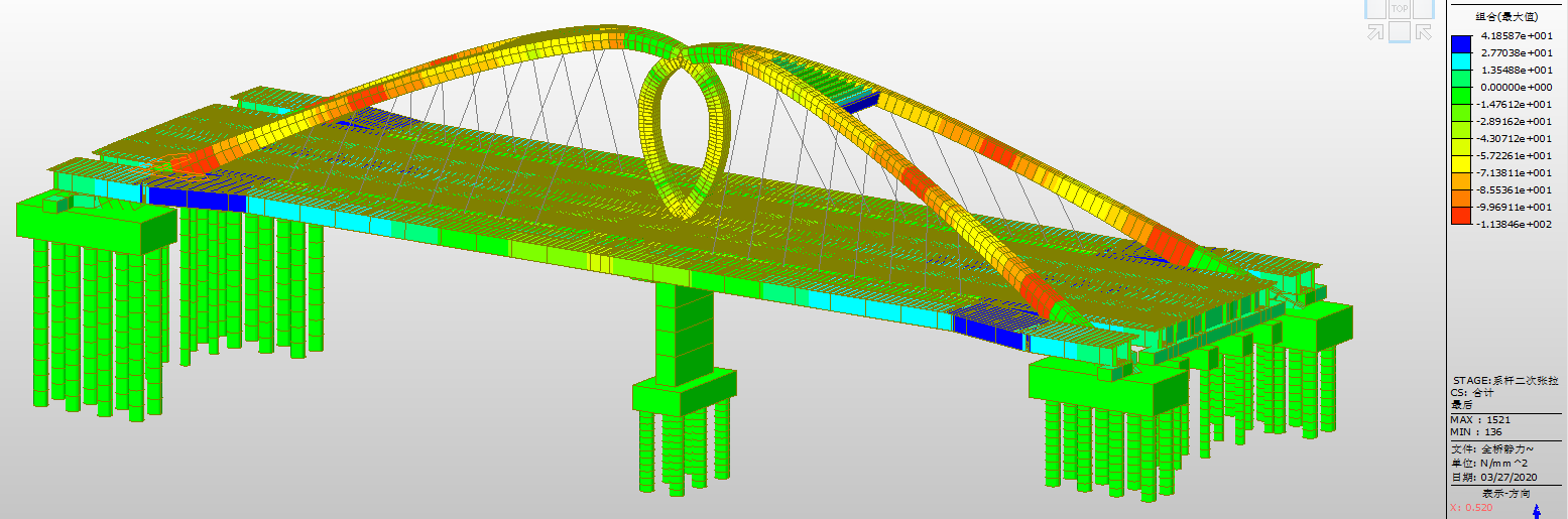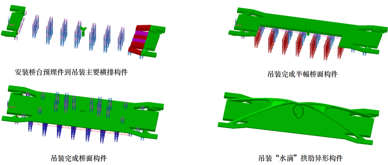 利用BIM模型完成桥梁成桥阶段内力和应力验算,对水滴形拱圈、拱脚等重要节点进行受力分析,保证钢构件拼装方案的安全性。