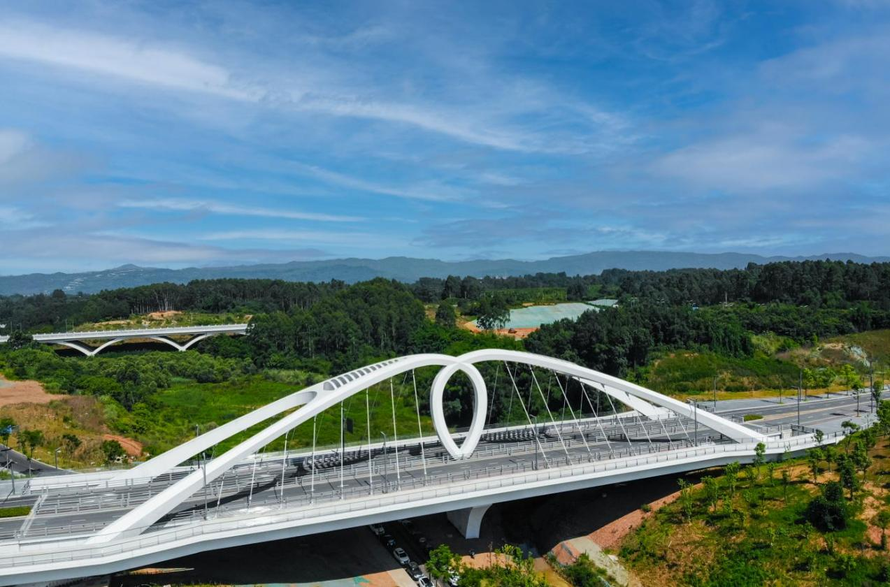 其中创意路、科智路、蜡梓路道路总长度约2051米,景观桥梁2座,分别为:上承式空腹钢筋混凝土五跨连续拱桥1座,长316米;水滴形梁拱分离系杆拱桥1座,长160米,其结构形式及外观目前为全国首创。