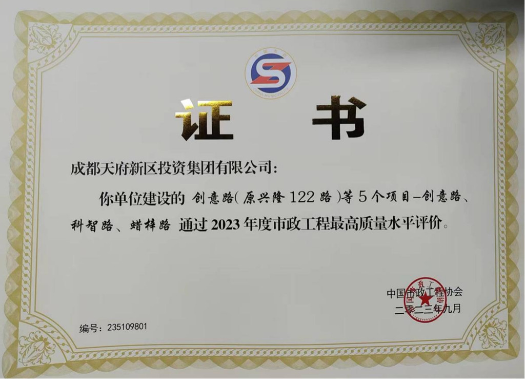 市政工程最高质量水平评价——由中国市政工程协会组织评审,是市政工程行业在工程质量方面最高质量水平评价,代表市政工程行业同时期国内先进水平。据悉,该5个项目由成都天投集团组织实施,本次也是天投的建设项目首次荣获该奖项。