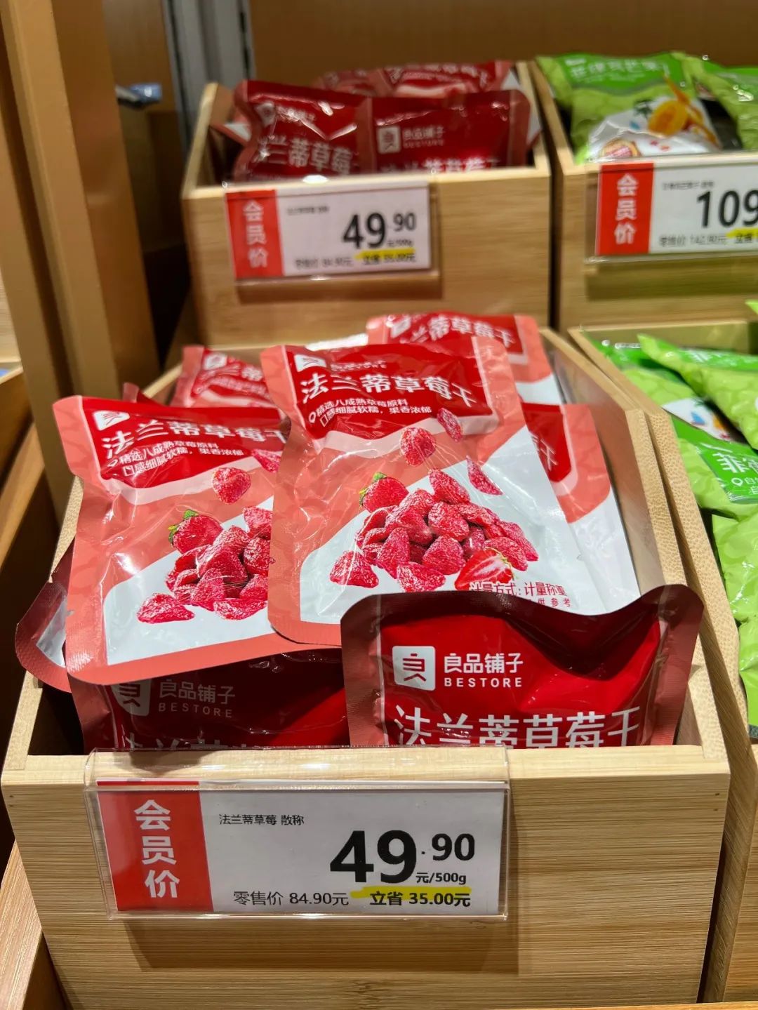 以良品铺子法兰蒂草莓干为例。法兰蒂草莓干此次降价幅度是41%,门店零售价从84.9元/500g降至49.9元/500g,降价35元。FBIF购买了一包法兰蒂草莓干,价格从10.53元降到了6.19元。