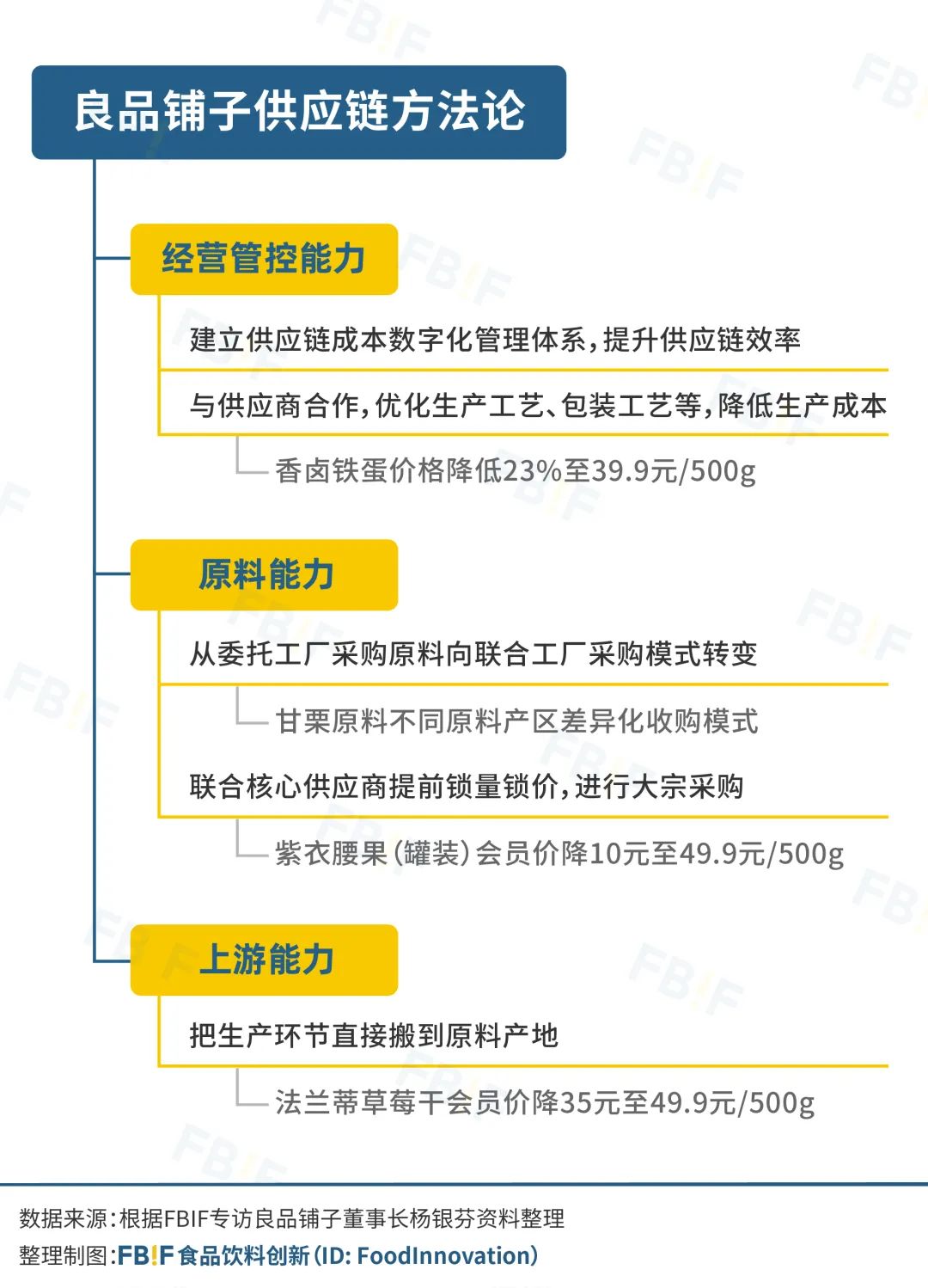 以良品铺子爆款单品香卤铁蛋为例,良品铺子将优化生产设备、改变剥蛋方法、提升包装工艺,以及引进色选机代替人工挑选“花蛋”,这一套生产方法论赋能给香卤铁蛋生产商,从成本侧一年节省105万元,反应到消费端,就是良品铺子的香卤铁蛋散称产品每斤价格降低23%至39.9元。