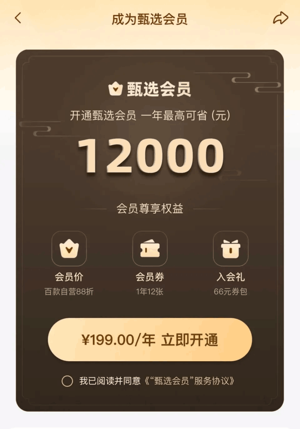 对于那些成为甄选会员的“丈母娘”来说“好不好”?享受自营品牌的88折、85折优惠,每月还能获得一张满100元可用的12元非自营品优惠券,以及包含多张指定用品券的66元限时入会礼包,是否可以吸引她们?引遐想。