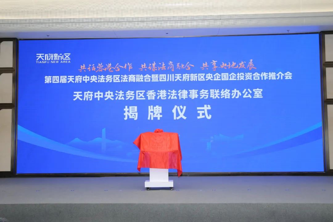 在与会领导及嘉宾的见证下,中交国际中心、中铁卓越中心等9栋楼宇业主分别与北京道可特、四川维信等9家律师事务所进行了四川天府新区“一楼一所”法律服务结对签约仪式;西南民族大学、四川师范大学、成都大学等在蓉高校及部分在蓉优质律所与香港韩润燊律师楼进行了战略合作签约仪式;四川天府新区分别与中建五局、中建西建矿业、招商蛇口、泸州老窖等央国企签订了项目合作投资协议。同时,天府中央法务区香港法律事务联络办公室在会上揭牌。