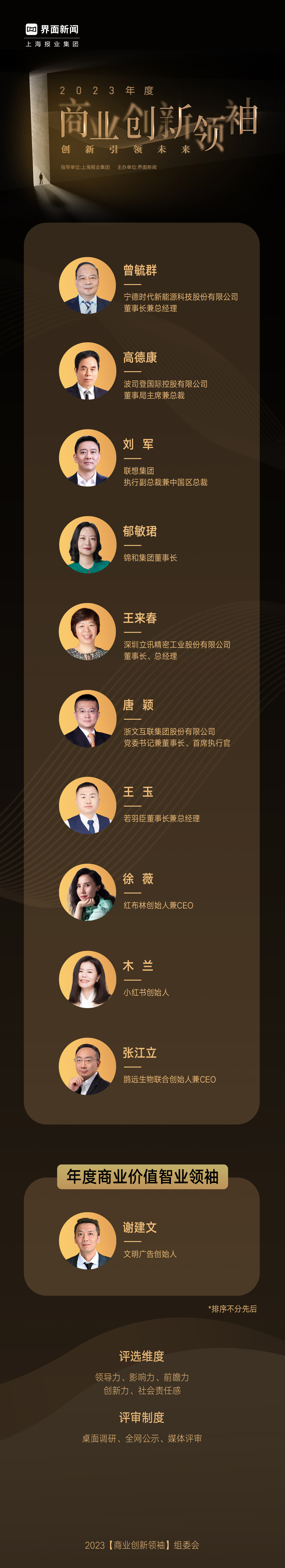 评选自今年5月正式启动申报,综合数据筛选、公众投票、媒体人投票与专家评审等结果,全面衡量领袖综合素质,最终10位以创新为己任的商业领袖荣登年度荣誉榜单。12月20日,上海报业集团|界面新闻在上海前滩香格里拉酒店举办了【2023商业创新领袖】颁奖典礼,正式公布了本年度的获奖名单(*姓名首字母排序)。