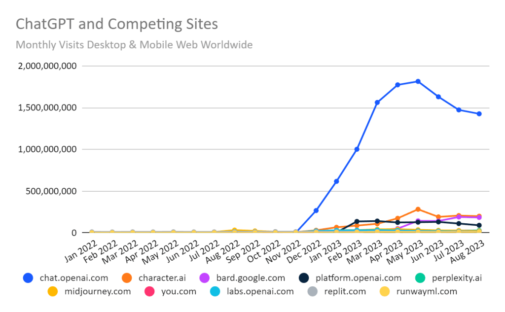 图:ChatGPT 在全球桌面和移动网站按月访问量统计