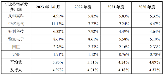 剔除这两家同行业可比公司之后,均崴电子的研发费用率则高宇同行业可比公司。