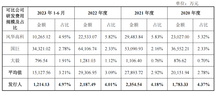 需要指出的是,报告期内,公司研发费用分别为1783.33万元、2354.54万元、2187.49万元和1214.13万元,占营业收入的比重分别为4.37%、4.18%、4.01%和4.97%,研发费用及研发费用率低于同行业可比公司。