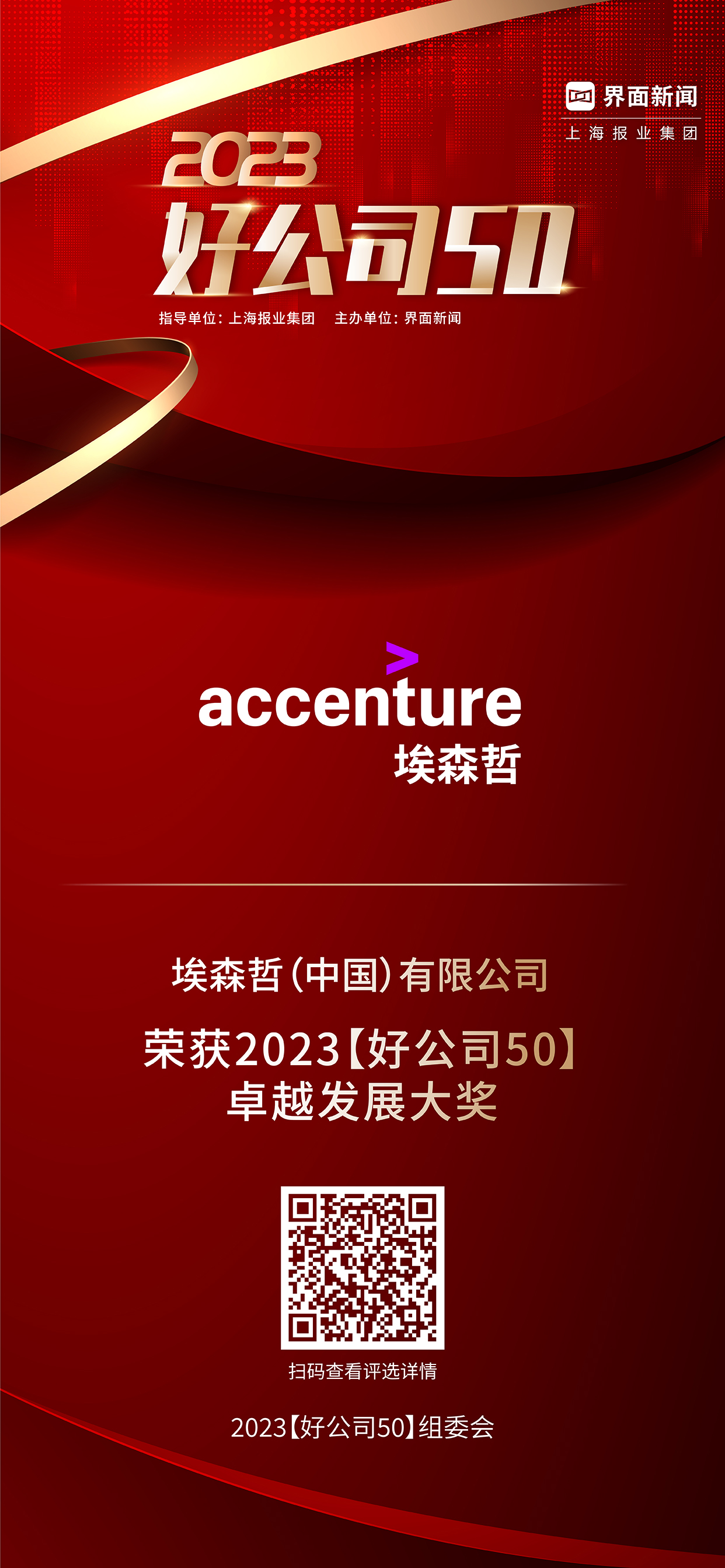 埃森哲(中国)有限公司荣获了【2023好公司50——卓越发展大奖】。