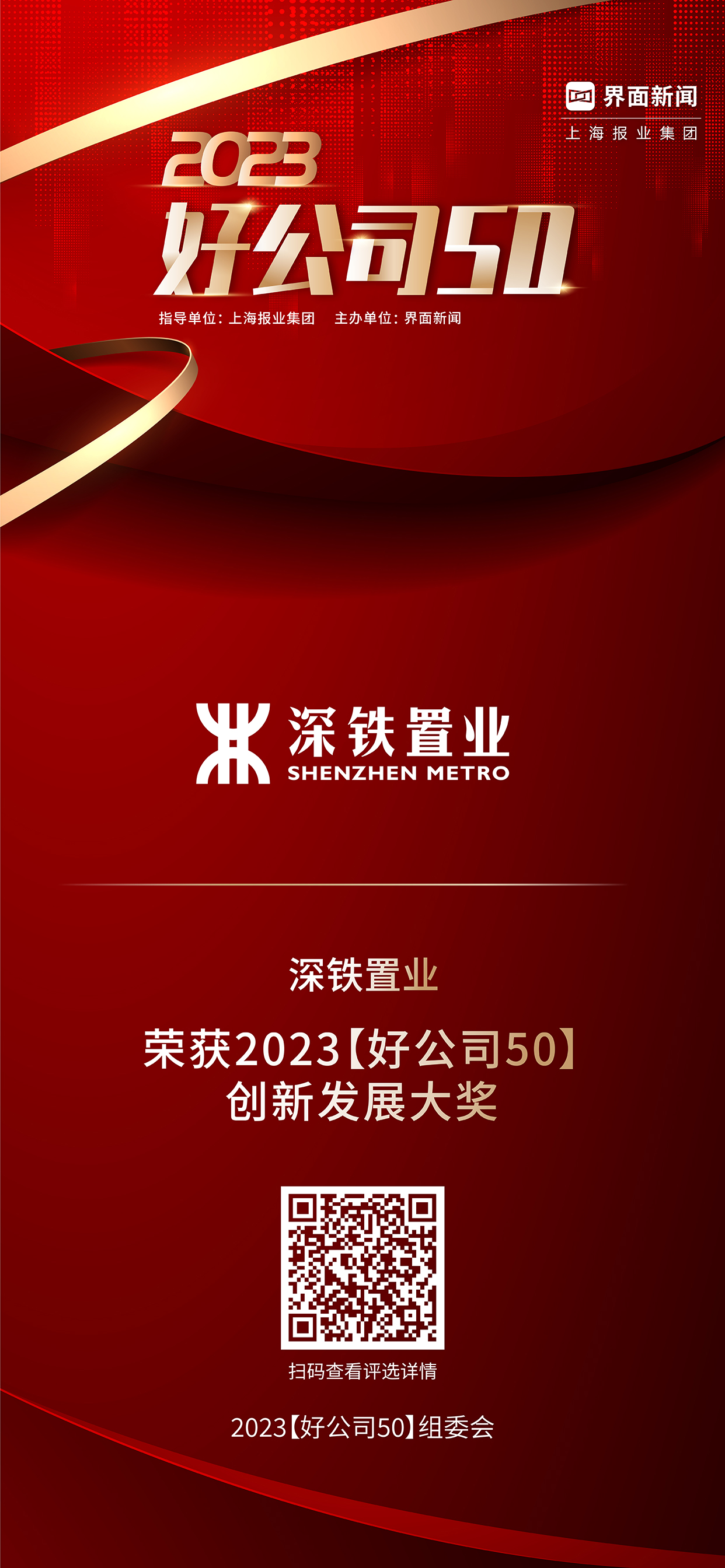12月20日,上海报业集团|界面新闻在上海前滩香格里拉酒店举办了【2023好公司50】颁奖典礼,正式公布了本年度的获奖名单。评选自今年5月正式启动申报以来,来自39个细分行业的500余家候选公司,经过近半年的大众投票、市场表现、创新活力、公司治理、社会声誉等方面的角逐,最终50家优质企业突破重围荣登年度荣誉榜单。深铁置业荣获了【2023好公司50——创新发展大奖】。