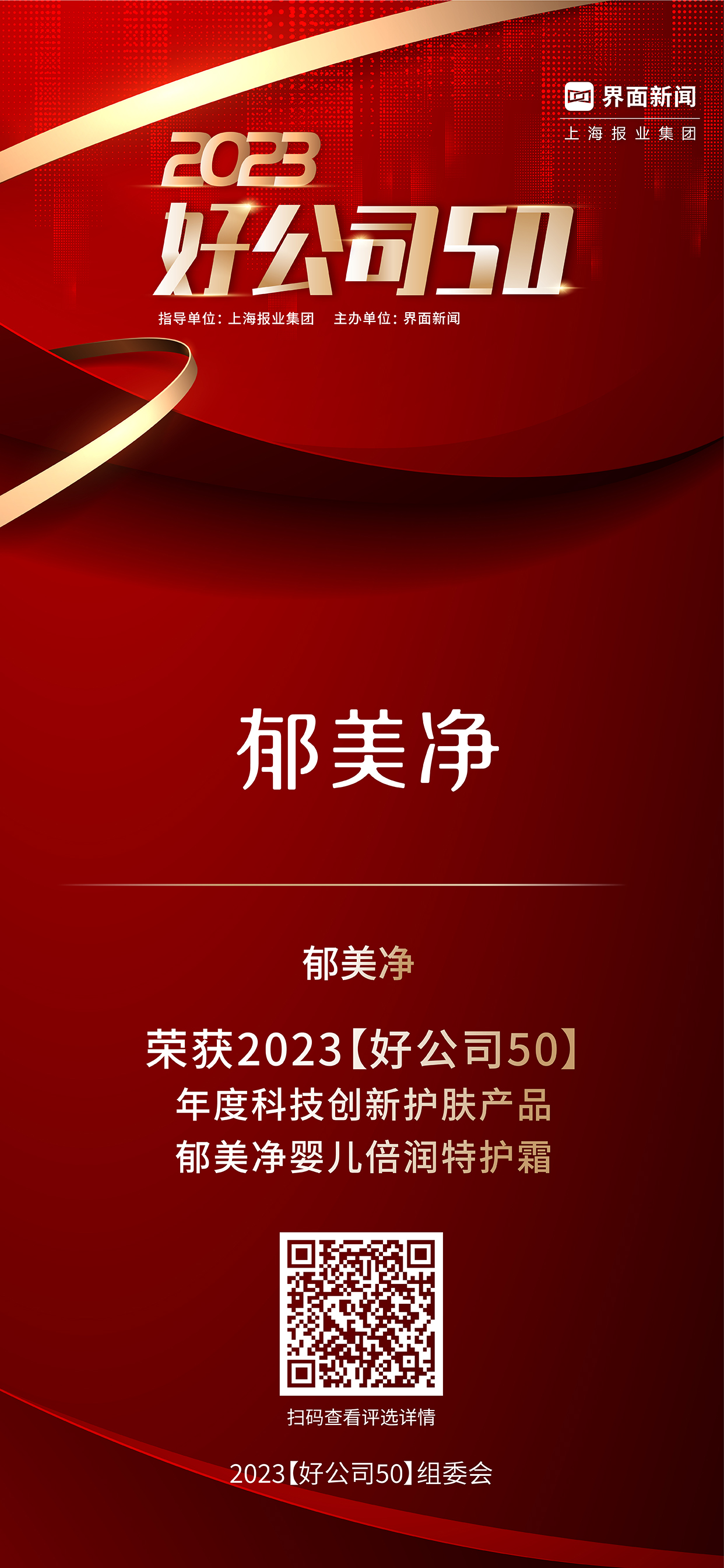 郁美净婴儿倍润特护霜荣获【2023好公司50】产品案例大奖-年度科技创新护肤产品。