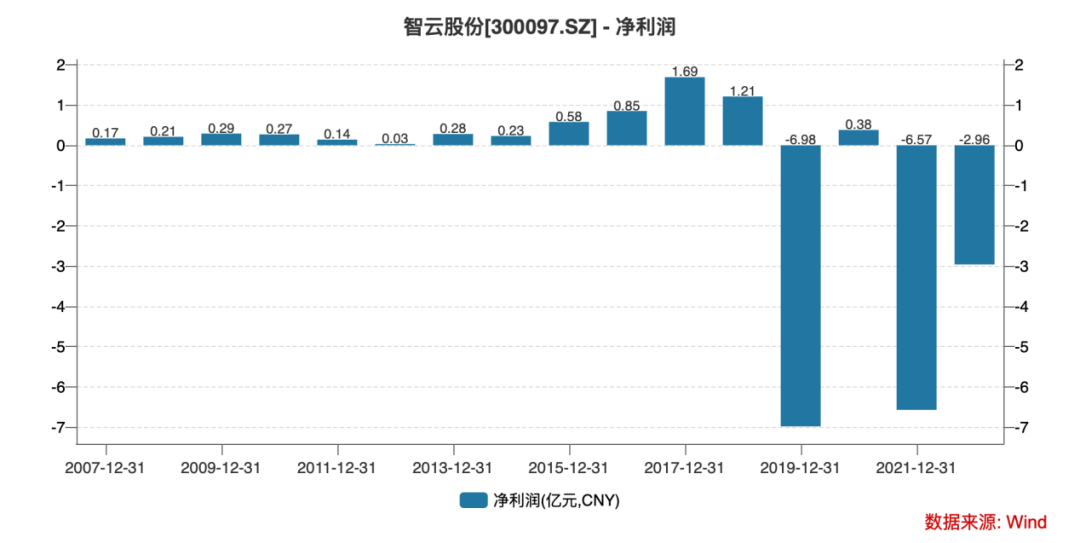 此后至今,智云股份净利润一直不乐观,2019年净亏损6.98亿元,2020年虽然盈利3800万元,但很快又陷入亏损。2021和2022年分别净亏损6.57亿元和2.96亿元。