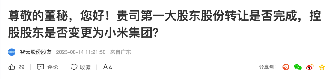 在小米汽车风头正热的当下,小米科技还曾是公司的第三大股东,持股比例5.37%。且智云科技在回复投资者提问时曾多次提到,“将积极拓展进入小米相关产业链的机会”。