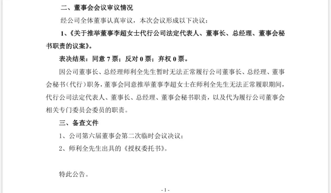 很快事情就有了新进展,12月18日,智云股份发布董事会临时会议公告,7名董事全票通过了《关于推举董事李超女士代行公司法定代表人、董事长、总经理、董事会秘书职责的议案》。在师利全暂时无法正常履行公司职务期间,由董事李超代行智云股份法定代表人、董事长、总经理、董秘职责,以及代为履行公司董事会相关专门委员会委员的职责。