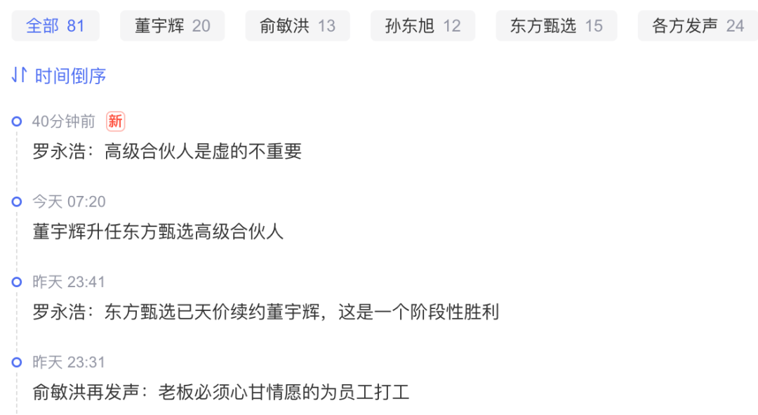 俞敏洪在此前回应中声称,没有网传的“孙东旭和董宇辉二选一”那么严重,又在昨日的直播中提到免去孙东旭CEO职位跟董宇辉没有关系,但事实真相如何不言自明。