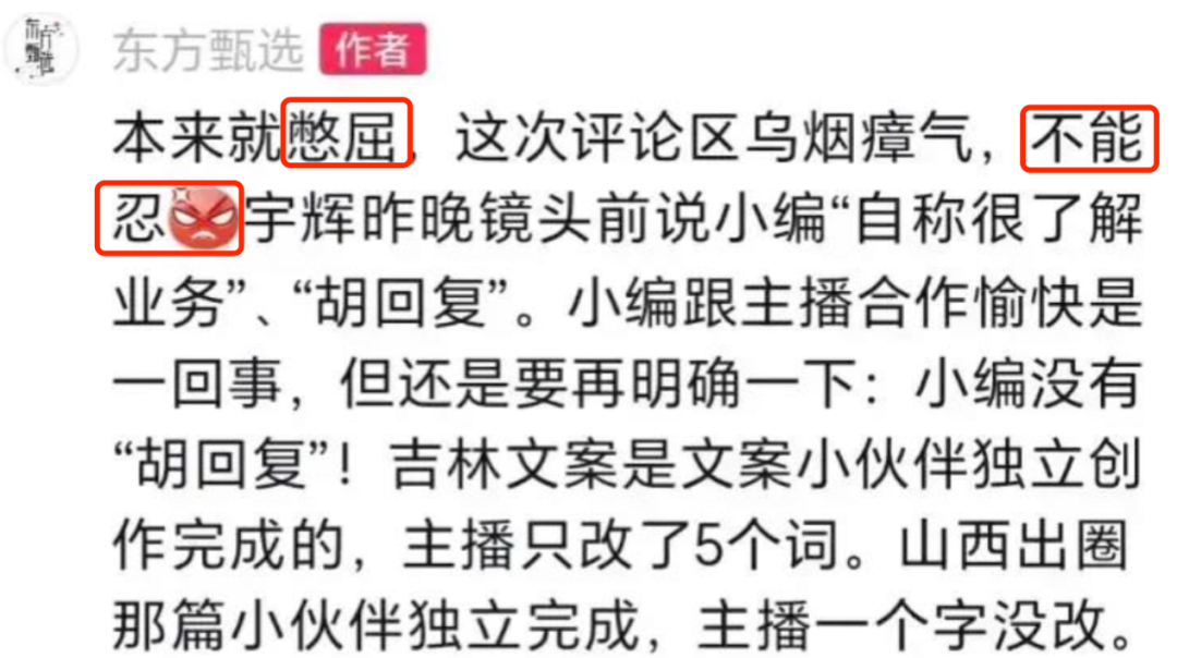 综上所述,粉丝们关切的问题,早已因为东方甄选一次次公开回应,从“董宇辉的小作文到底都是谁写的”,变成了“董宇辉有没有受到欺负”。