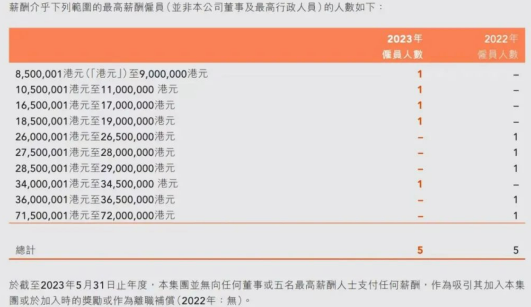 除高管团队外,公司5名薪酬最高的员工薪酬总计7855.4万元。其中最高一人为34000001港元至34500000港元,约合人民币3000万元左右。