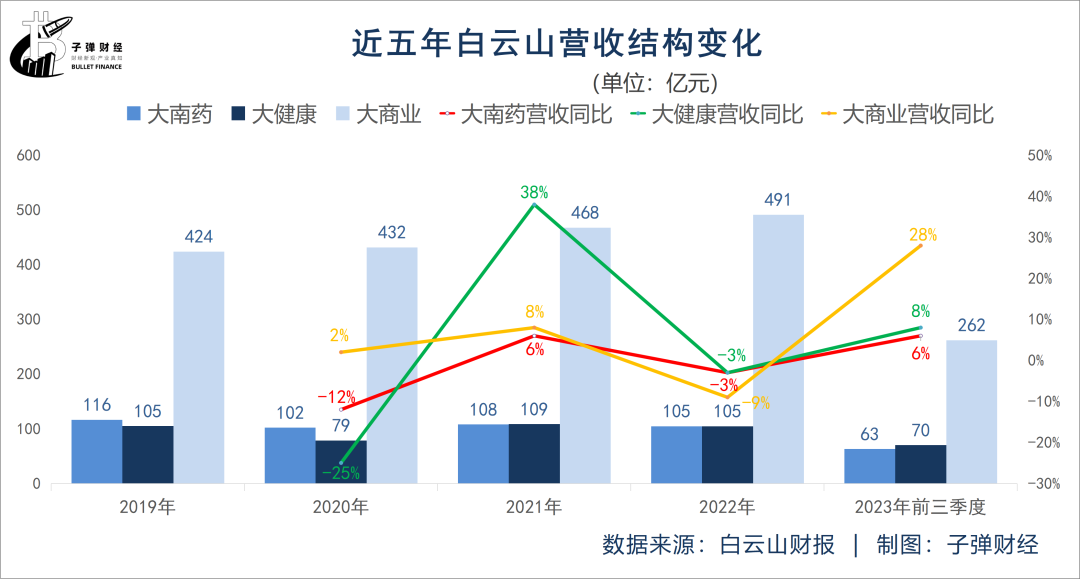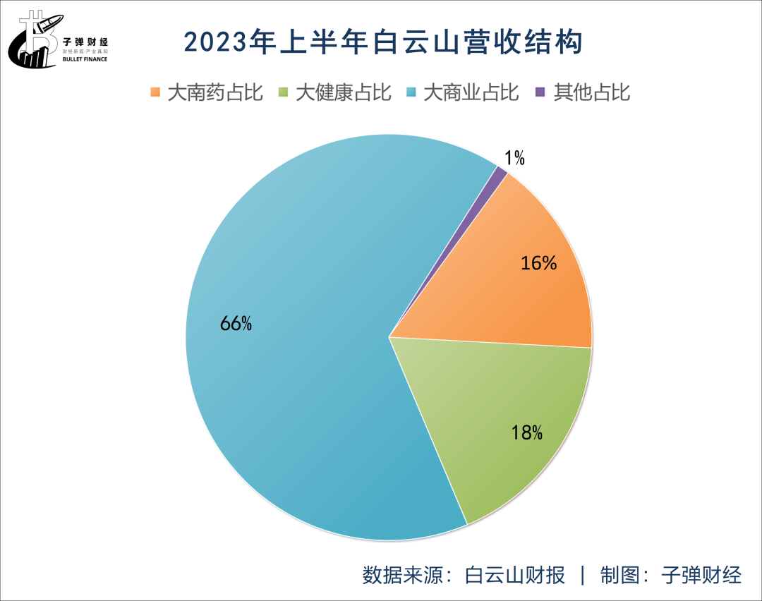 从营收结构来看,2023年上半年,大商业板块给白云山带来的营收贡献最大,占比66%,同比微涨5%,但较2018年上半年109%的增速,已然骤降。