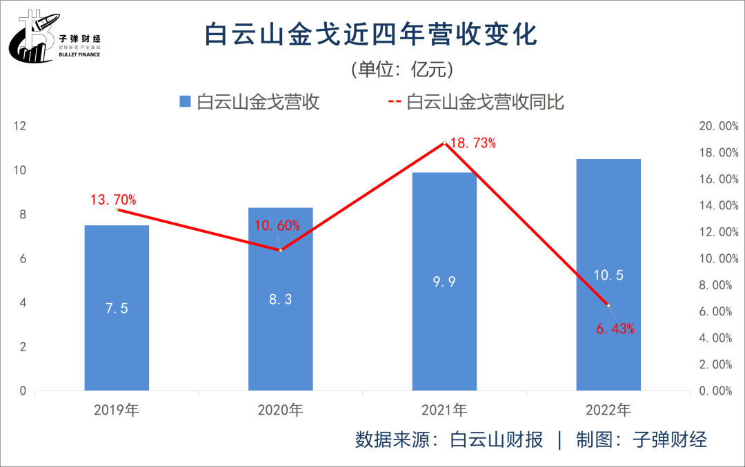 但是2022年,金戈的销量出现了首次下跌,销量为8682.91万片,同比下滑12%。2022年,白云山金戈营收10.52亿元,同比增长6.43%,增速较前三年有所放缓。