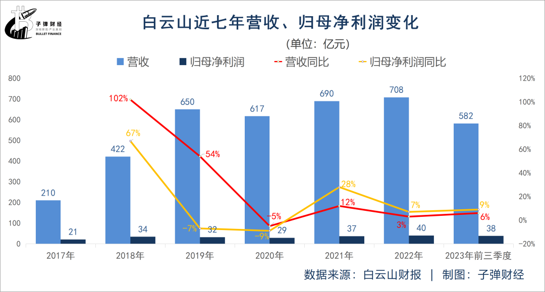 具体来看,2023年前三季度,白云山营收、归母净利润分别为582亿元、38亿元,仅同比微涨6%、9%。从单季度来看,第三季度,白云山营收182亿元,同比微增3.58%,环比下滑0.7%。