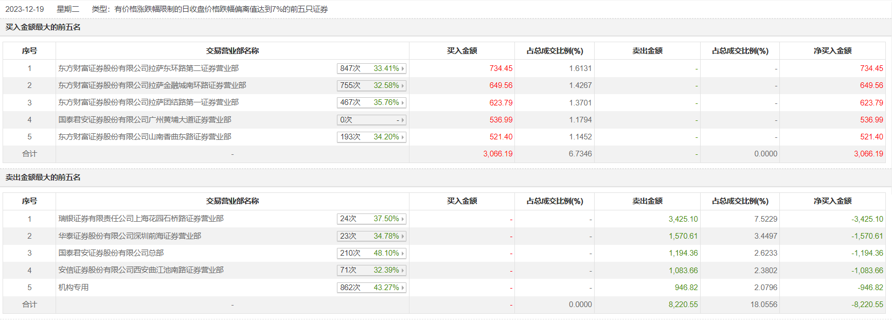 欧亚集团12月19日跌停,全天换手率达19.67%,振幅达6.45%。龙虎榜数据显示,营业部席位合计净卖出5154.36万元。其中,机构合计净卖出946.82万元。此外,瑞银证券上海花园石桥路证券营业部、华泰证券深圳前海证券营业部分别卖出3425.10万元、1570.61万元;东方财富证券拉萨东环路第二证券营业部、东方财富证券拉萨金融城南环路证券营业部分别买入734.45万元、649.56万元。