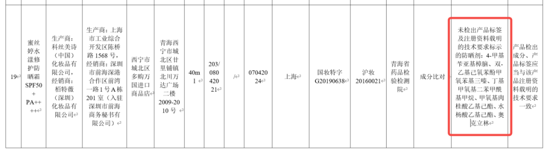 以通报中显示未检出的4-甲基苄亚基樟脑防晒剂为例,在国家药监局公示的该款产品的配方成分中,该防晒剂在产品共计32个成分中为例第8位。
